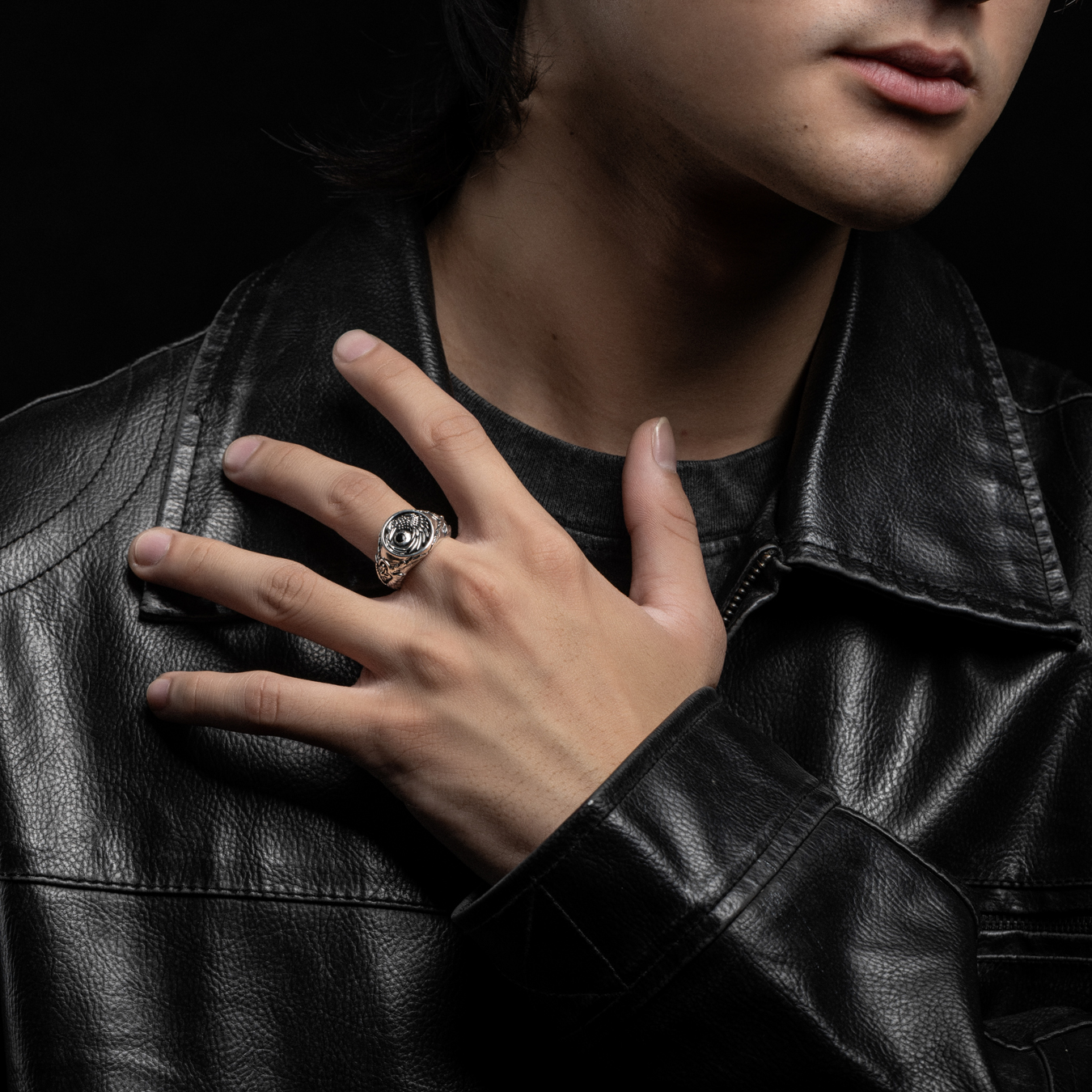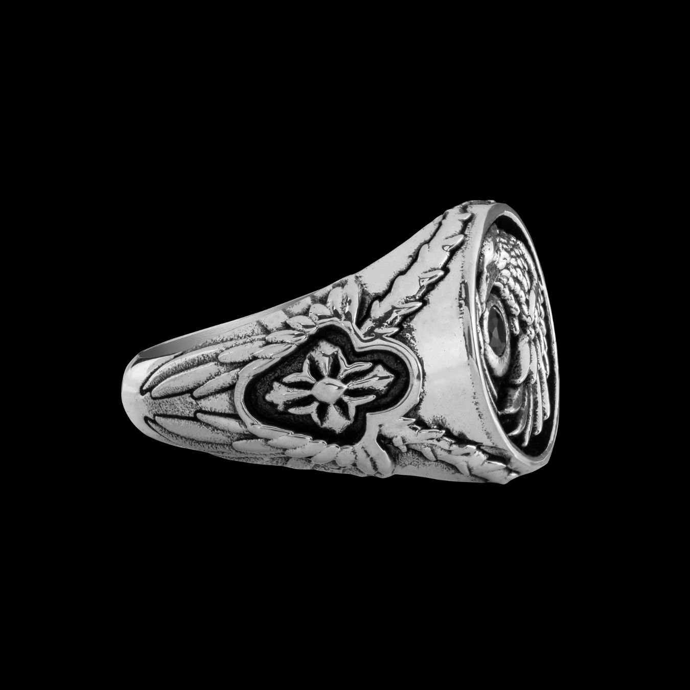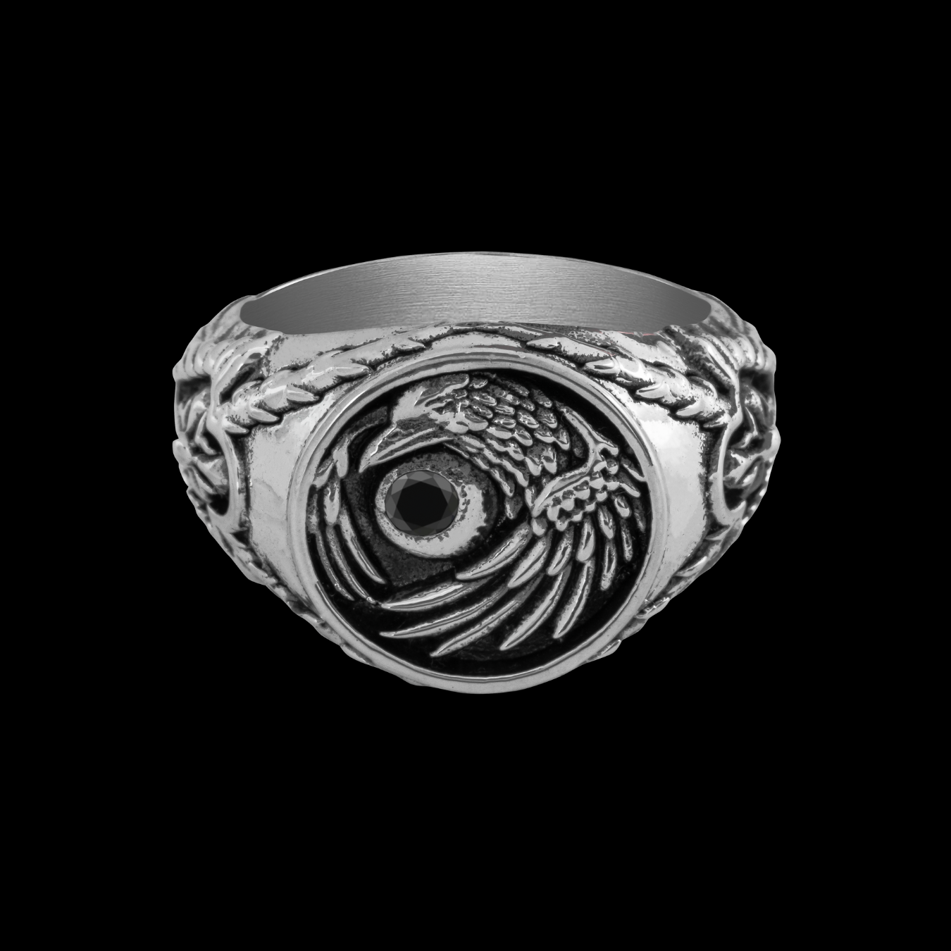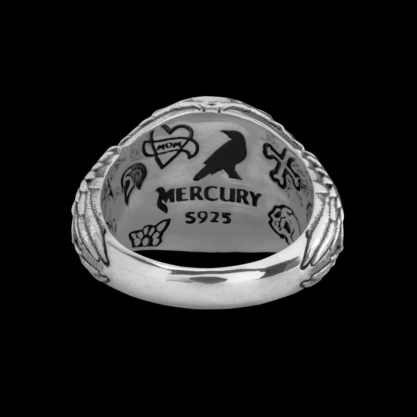 Từng chi tiết lông vũ được tạo tác nổi khối. Hình mặt trăng được tượng trưng bằng đá CZ đen quý phái. Đai nhẫn bản dày, được thiết kế tỉ mỉ bằng họa tiết cánh chim quạ và họa tiết signature phá cách của Mercury. Mặt trong thân nhẫn còn được trang trí bằng những hình xăm old school mang năng lượng của tâm hồn say mê tự do.